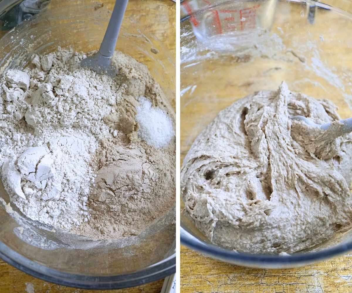 - In a large bowl combine the gluten free sourdough starter, with ground flax seeds (sifted), psyllium husk and water. Mix with a spatula until incorporated.