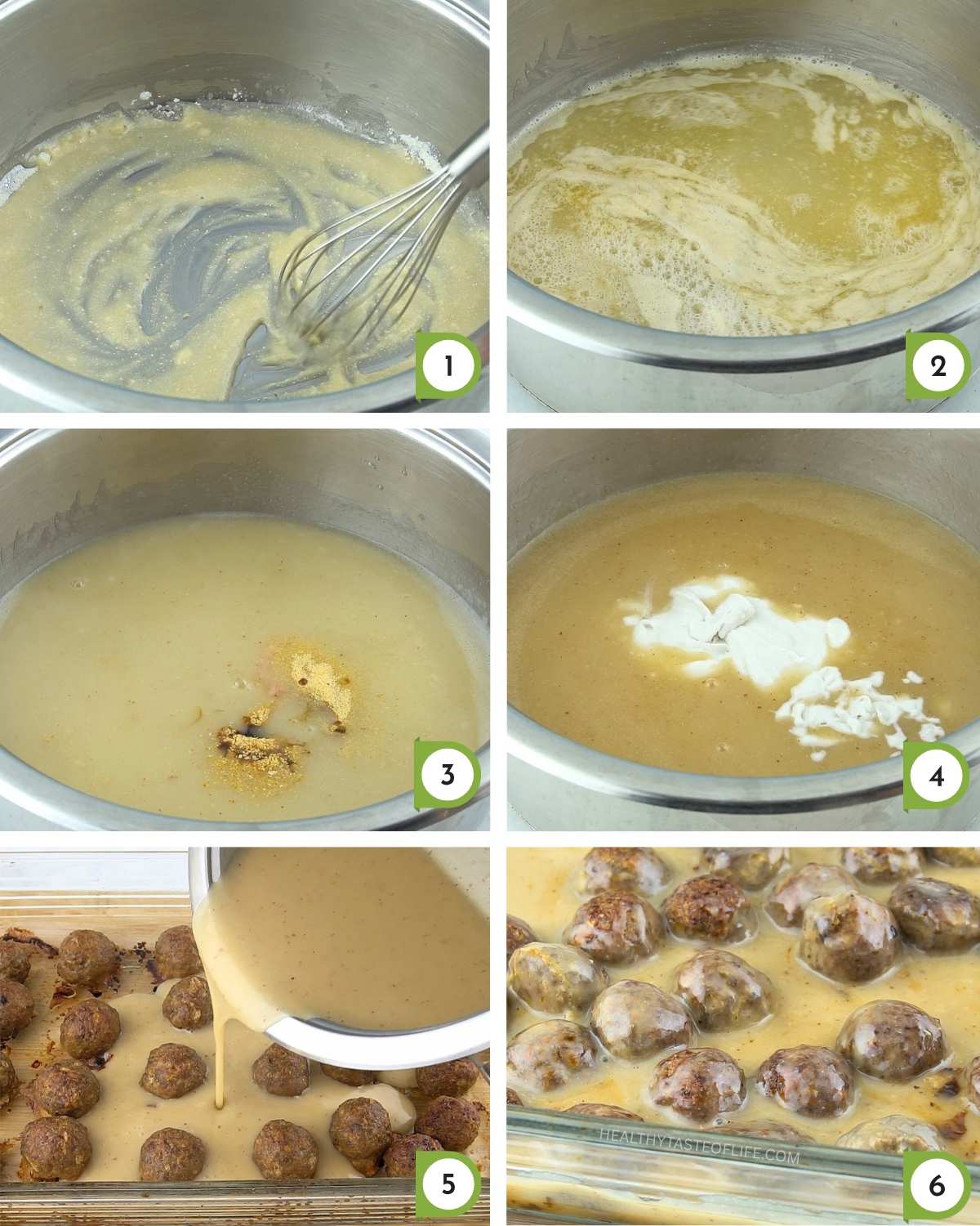 Process photo collage – making the dairy free creamy sauce in a skillet (tomato free) for the gluten free Swedish meatballs.