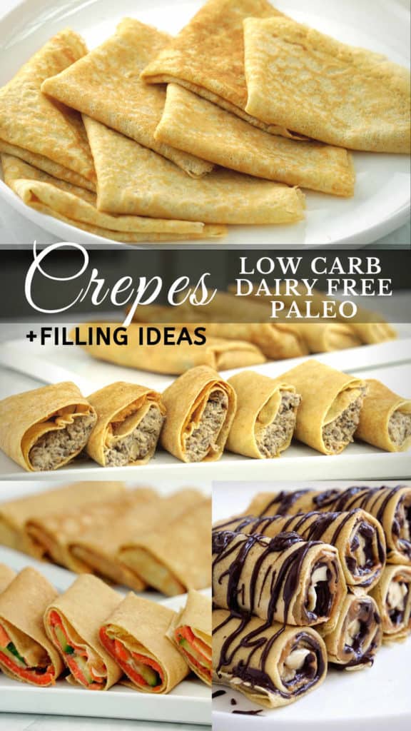 Almond Flour Crepes – low carb, grain free, gluten free, thin, flexible and delicious. These crepes are also dairy free, keto and paleo compliant. Serve these almond flour crepes with 3 different sweet or savory filling ideas.